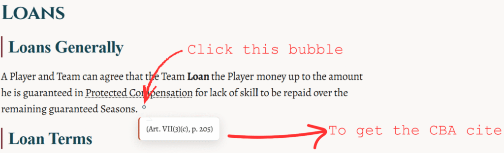 The majority of The Guide has citations to the sections and page numbers of the CBA. If you hover your mouse over the paragraph, and you see a bubble appear (or if mobile, tap on the paragraph to make the bubble appear). Click the bubble for the citation. Example below: